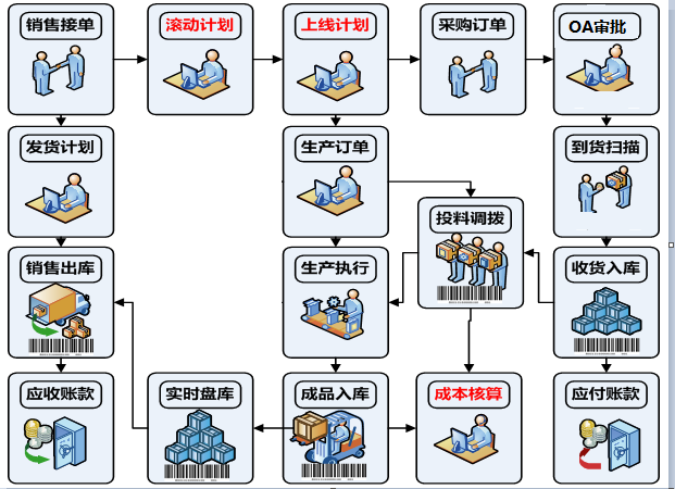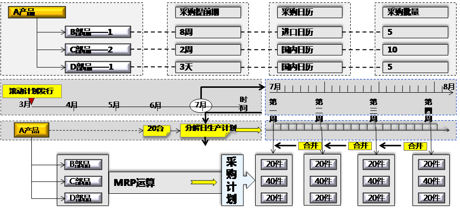 1. 銷(xiāo)售接單后,計劃部門(mén)編排1個(gè)月的滾動(dòng)計劃,MPS運算出生產(chǎn)計劃、MRP運算出采購計劃。